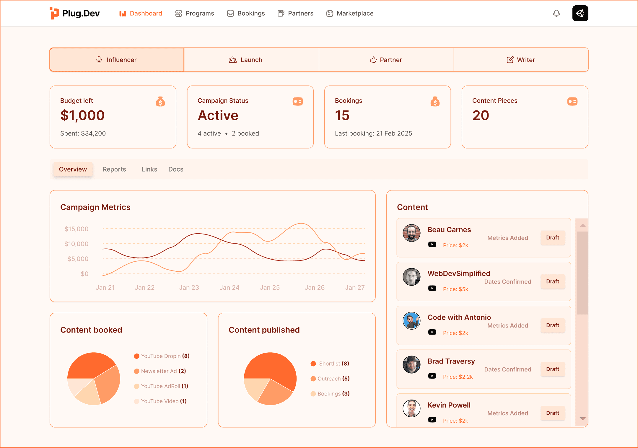 Elevate your Dev Influencer marketing from isolated sprints to a continuous strategic advantage. Build an always-on program with Dev Influencers. Book influencers, manage everything centrally, and get real performance data for ongoing optimization.