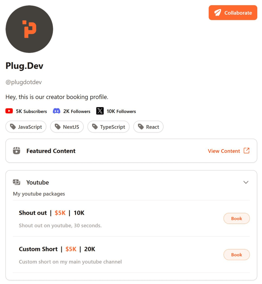 Highlight your best content, define your niches, list pricing, and let DevTools start a collaboration.