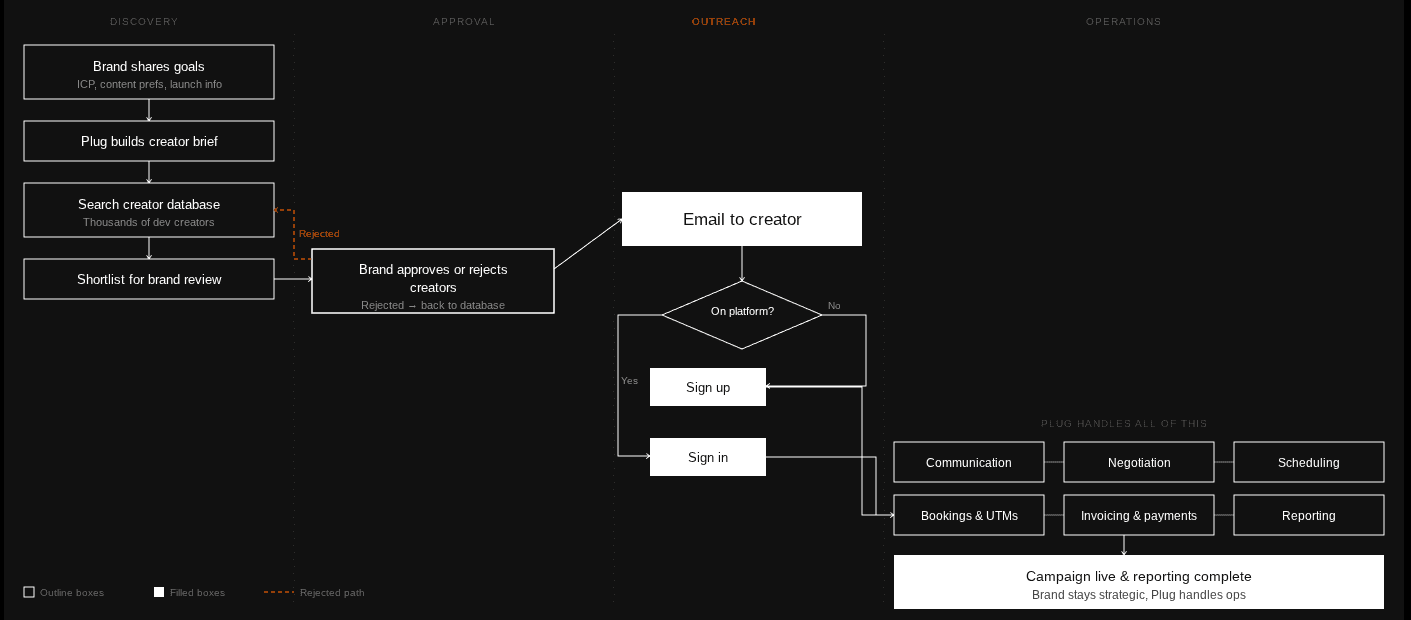 The goal is simple: brands stay focused on strategy and key creator relationships while Plug handles the operational work.